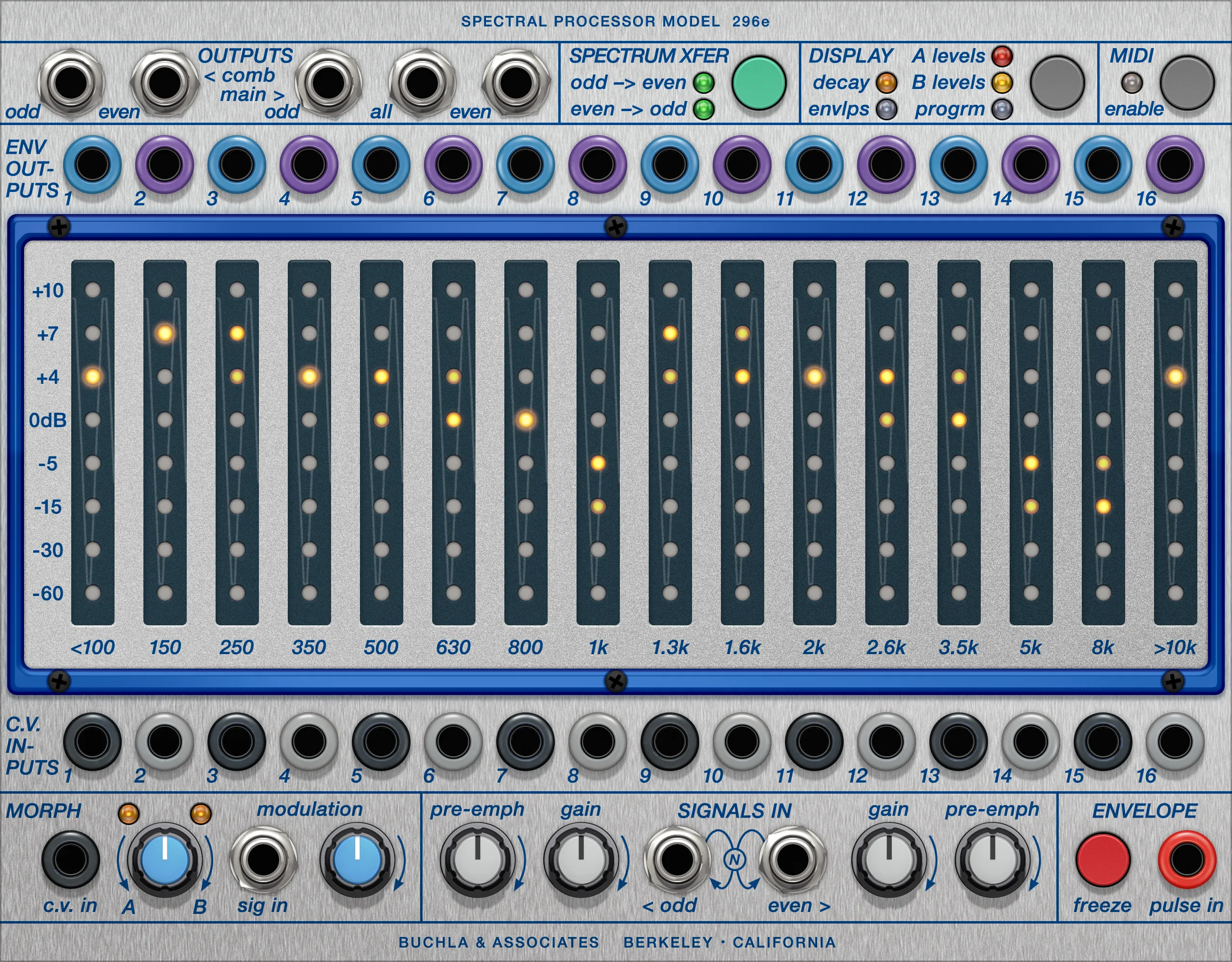 Buchla 296e is a filter bank/VCA combo with particular features that unlock spectral transfer and spectral modulation capabilities. Since the unit processes both analog and digital signals, the project required both the modeling of the analog circuitry and the emulation of the firmware running in the original hardware. Moreover, special care has been taken in modeling the AD and DA converters, in order to get the closest possible emulation.