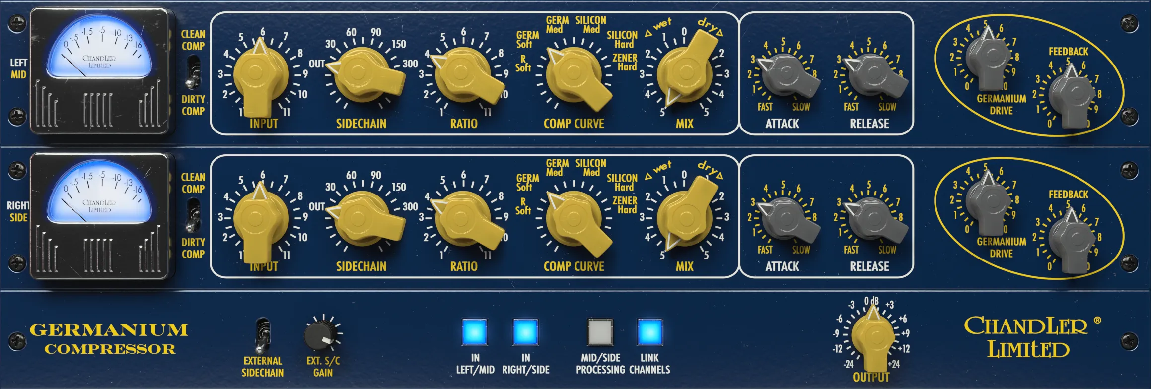 The Germanium Compressor is a versatile JFET compressor with a characteristic discrete germanium amplifier. The original circuitry is characterized by multiple non-linear behaviors placed in various feedback loops; this required extreme care in the modeling process. The original mono hardware has been enhanced with stereo, mid-side, linked and un-linked processing capabilities.