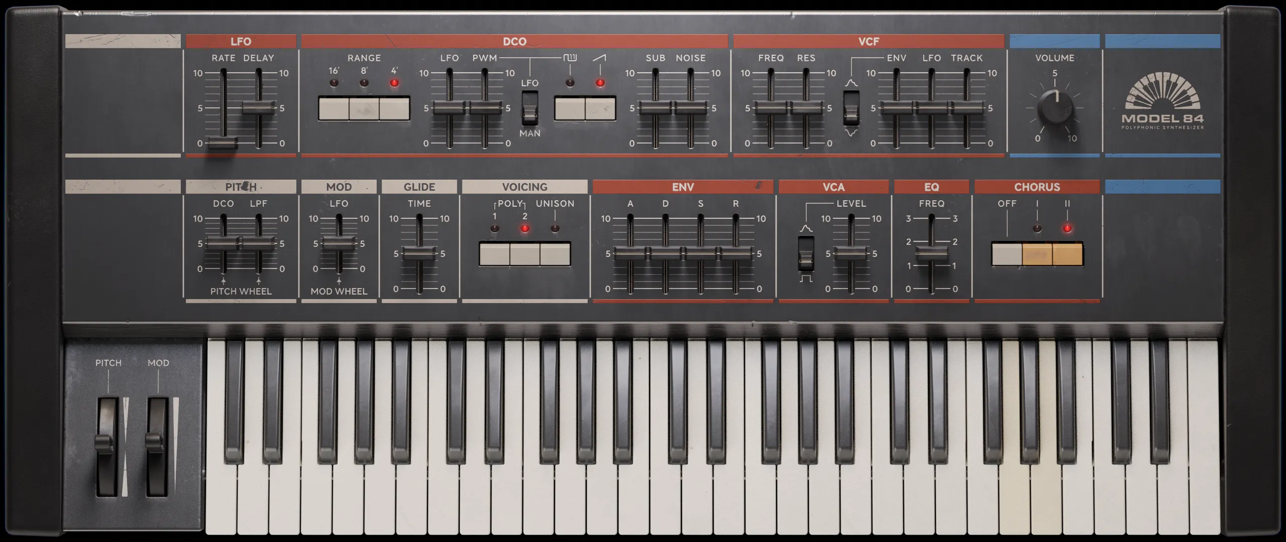 Model 84 is Softube's first fully modeled polyphonic synthesizer. This required the development of new circuit modeling techniques that combined both accuracy and a limited CPU consumption. Special care has been taken in developing the original voice allocation modes, replicating the chorus noise and in emulating the phasing artifacts characterizing the Unison mode.