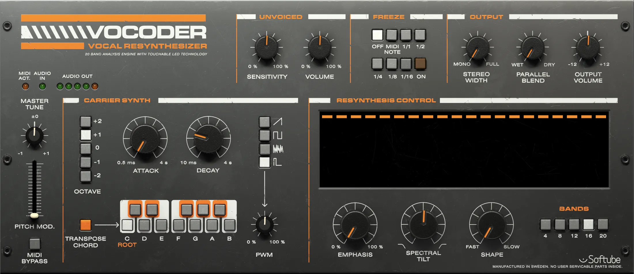 Softube Vocoder is the first project I worked on at Softube. Special care has been taken in developing an easy-to-use vocoder with built-in polyphonic synthesizer. The implementation proved to be non-trivial due to the limitations, both in memory usage and CPU performance, of the hardware the product is designed to run on.