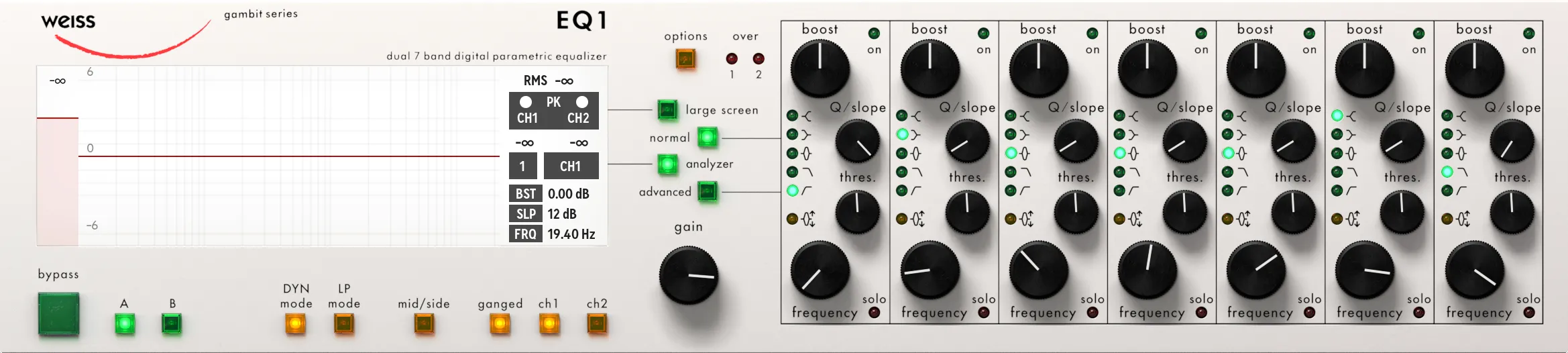 This project was a different challenge since no circuit modeling was needed, being the hardware completely digital. I handled the pre-study, analysis and algorithm porting of the IIR filters, linear phase algorithm and dynamic model. I was also in charge of the set up of the main structure of the whole plugin.